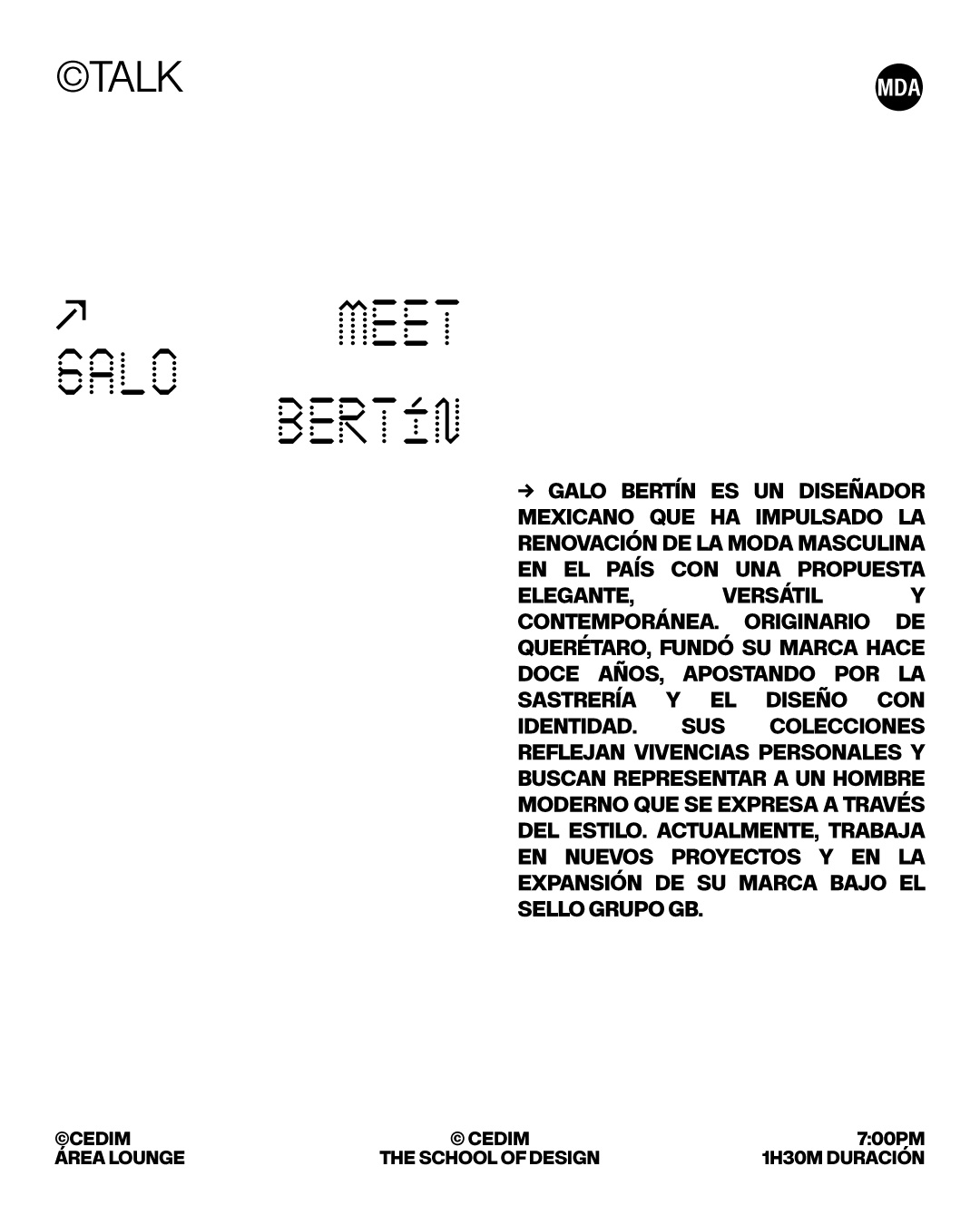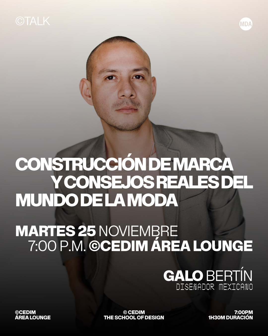 El reconocido diseñador mexicano Galo Bertín llega al ©CEDIM para compartir su visión, su experiencia en la industria y los aprendizajes que han marcado su trayectoria—una oportunidad para conocer de primera mano lo que implica crear y posicionar una marca de moda con autenticidad, propósito y estrategia.
